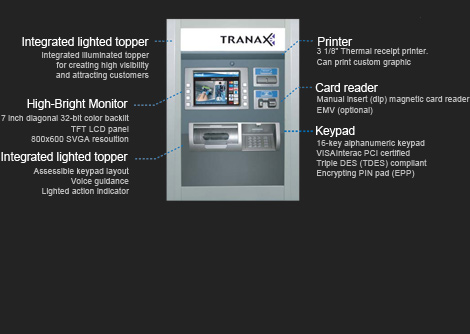 The all new Tranax 4000T ATM provides an ecconomical, high performance through-the-wall solution. Designed and built with compact modular components and engineered for easy installation. |